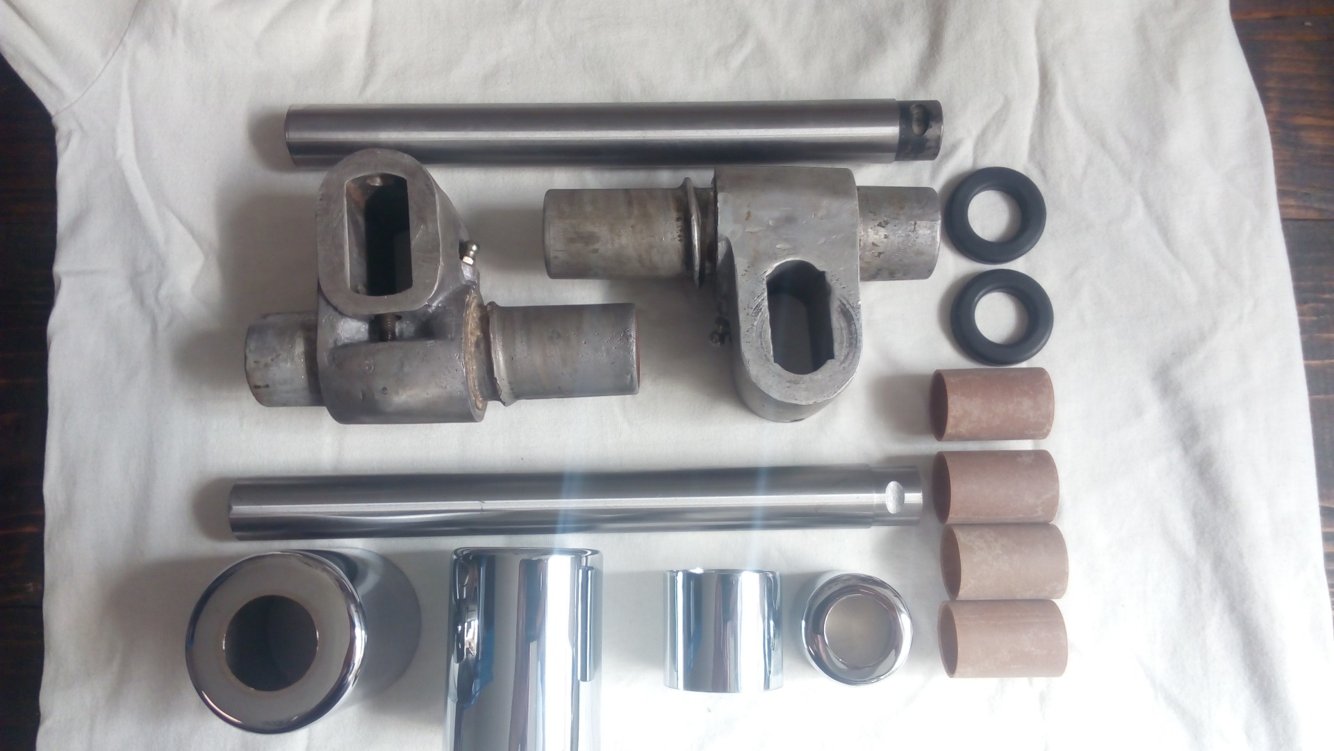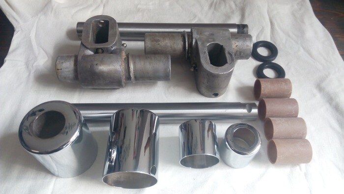 Repas kluzáků jawa 250-11. Na přání majitele těla kluzáků jen očištěna, bez mechanicko-chemického čištění hliníku, které díly krásně oživí. Byla provedena výměna pertinaxových pouzder, přestružení pro nové cementované – kalené – broušené trubky.