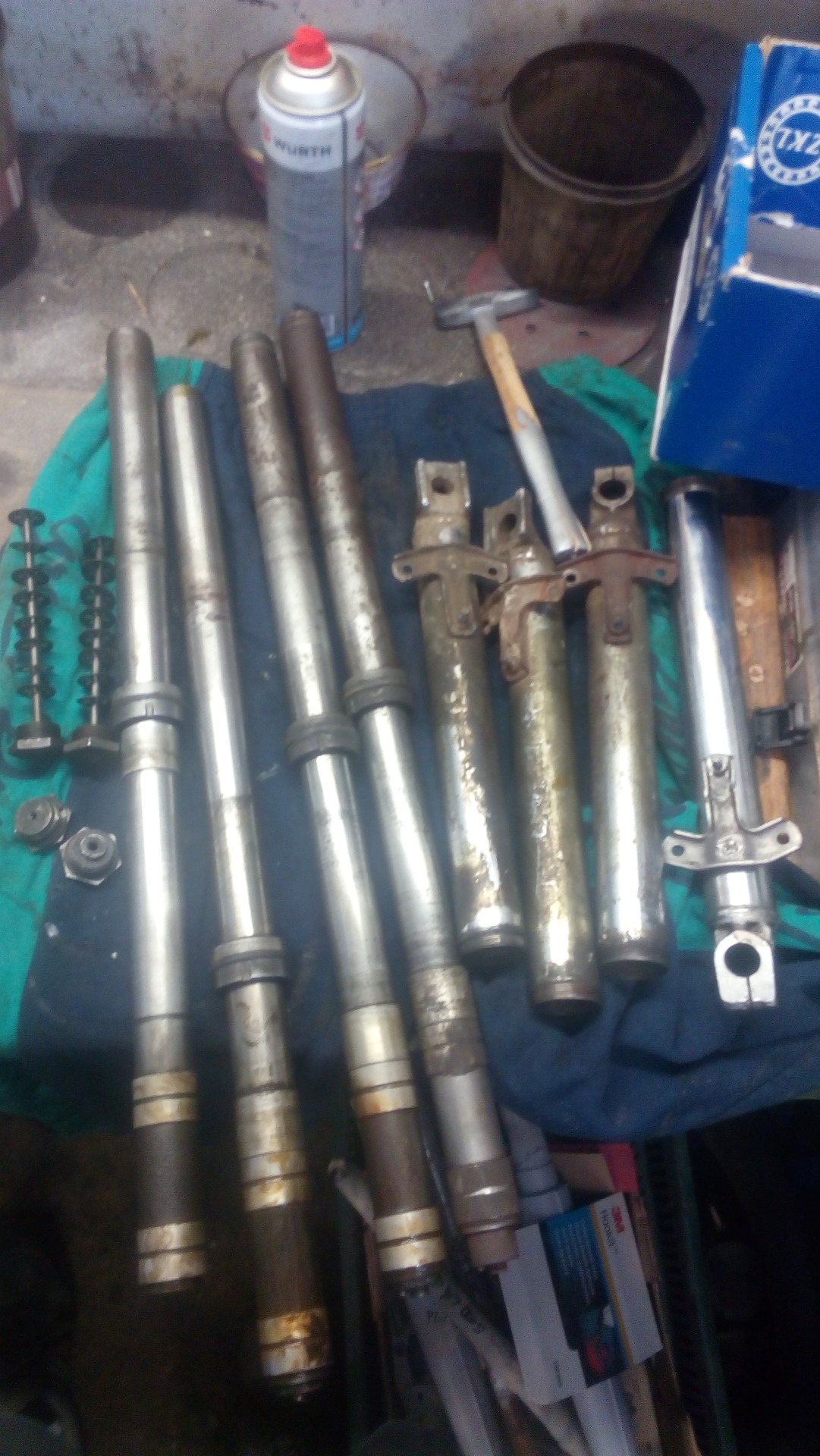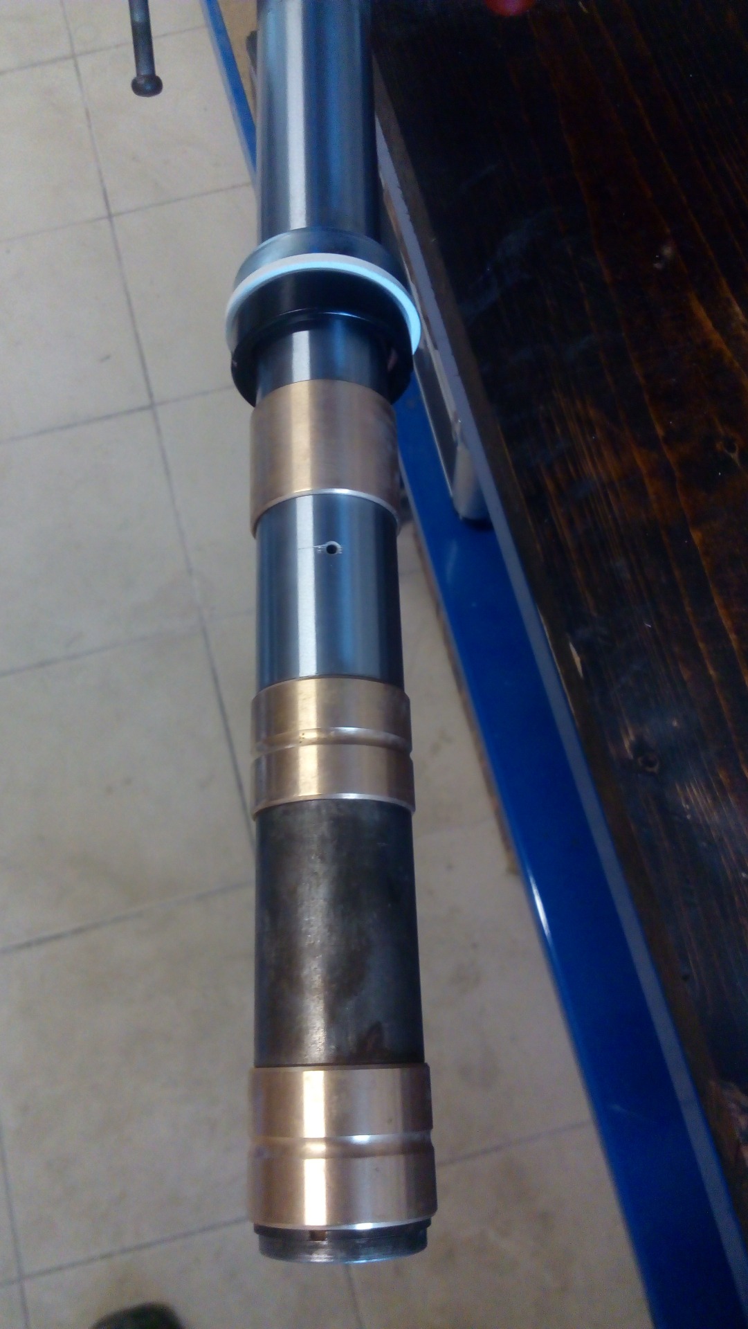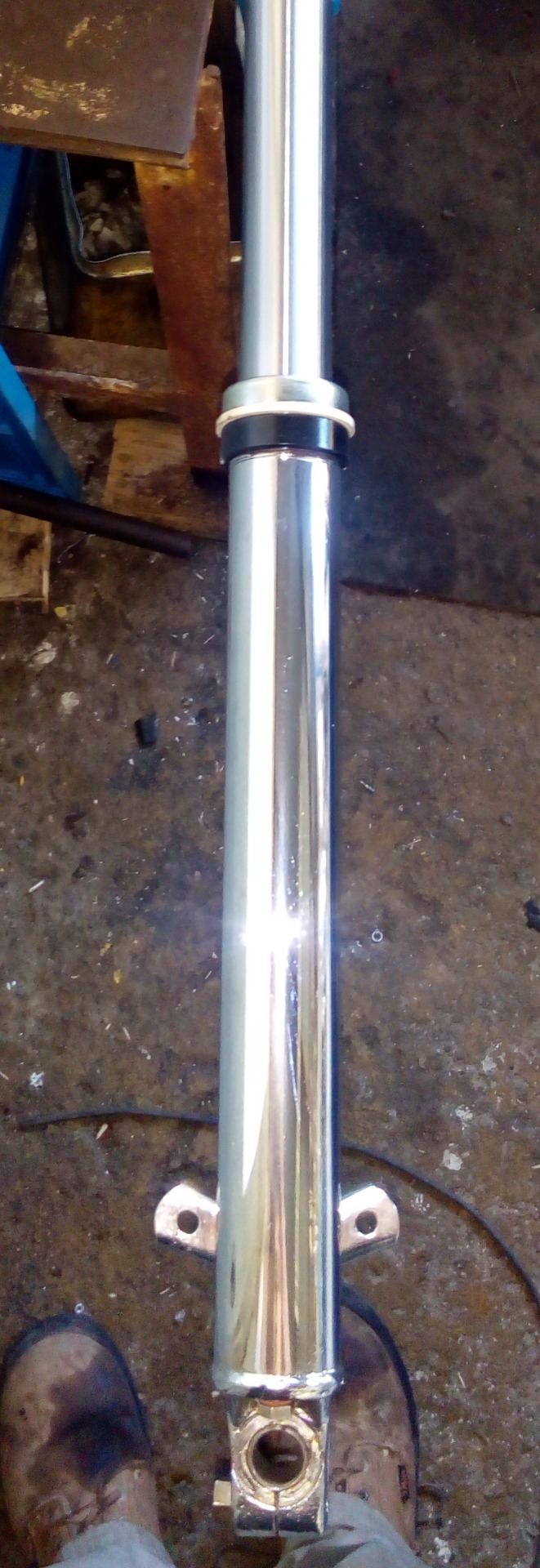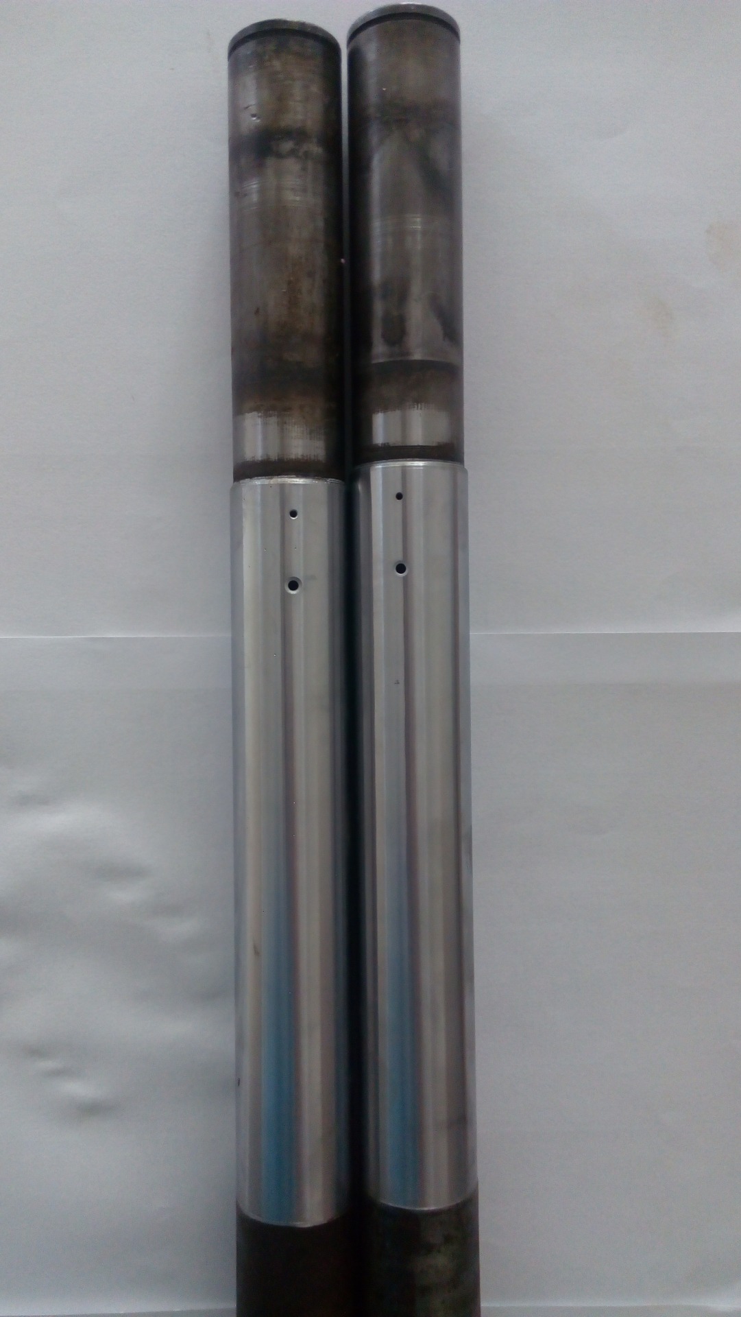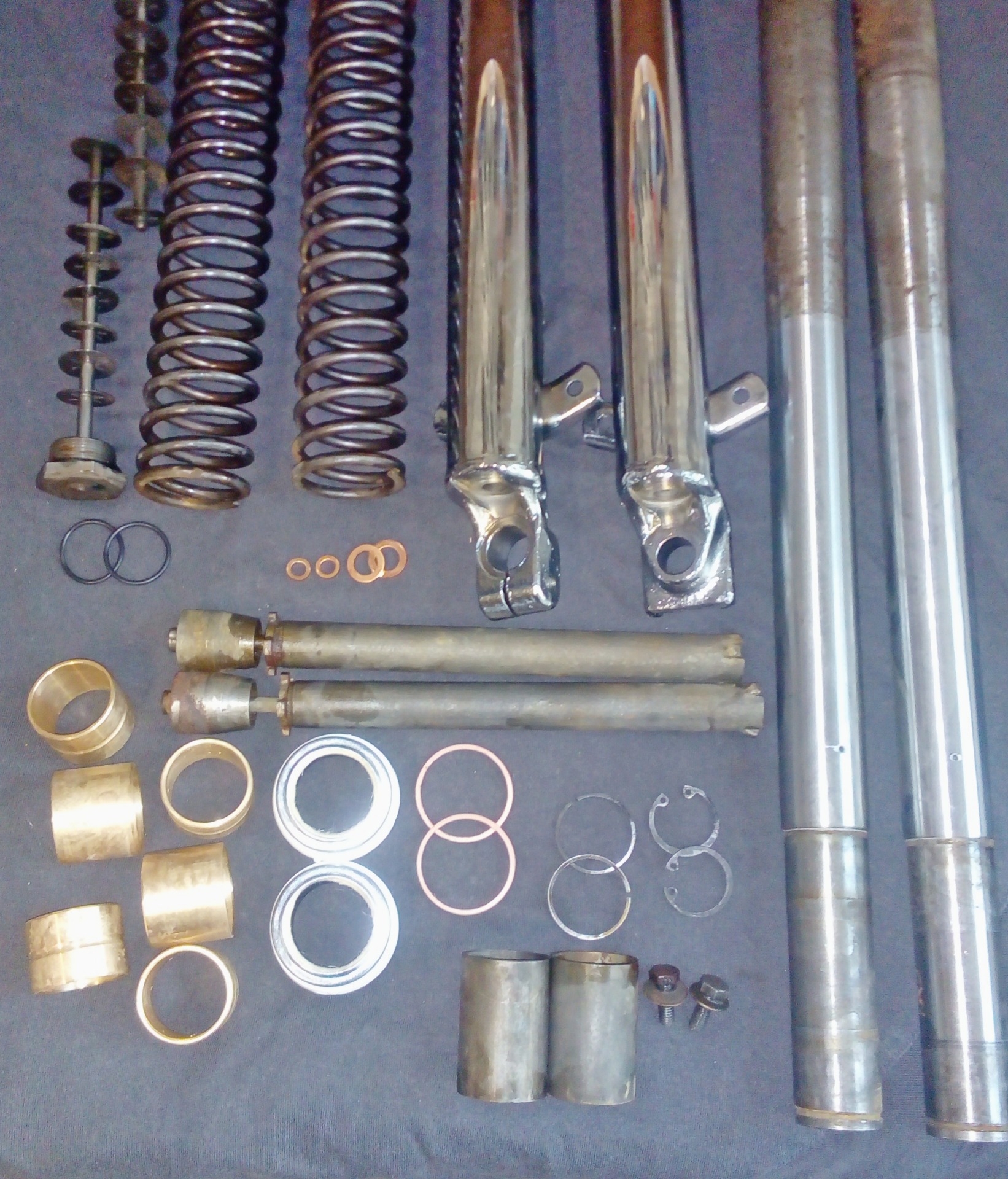 Po předchozí telefonické domluvě mi vidlice byly zaslány poštou. Byly zcela zatuhlé, jedna viditelně ohnutá. Provedlo se vyrovnání trubek, kontrola házivosti, tvrdochrom, důkladné vyčištění a na přání zákazníka montáž bronzových pouzder s vyšší životností. Nakonec vše zkompletováno.