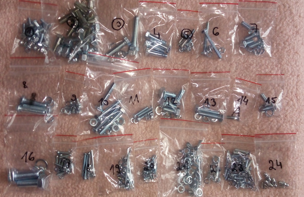 Kompletní sada šroubů určena k renovaci Vašeho skútru. A to pro oba typy – 501, 502. Sada obsahuje všechny potřebné šrouby, matice, pérovky, závlačky, mazničky, ke karoserii, podvozku, vidlicím, kolům, vlaštovkám, dvířkům, přepínači, tlumičům, atd… Vše úhledně zabaleno a označeno místem kam daný šroub patří.