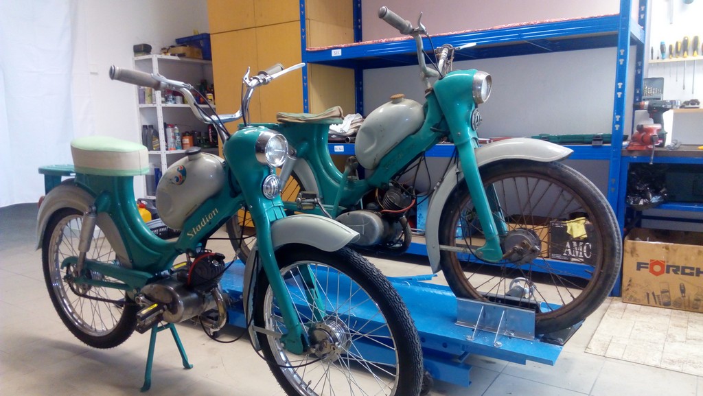 Stadion S22 dodaný od zákazníka na kompletní renovaci. Je kompletní, ale ve špatném mechanickém stavu a zcela nepojízdný. Majitel je lakýrník a tak jsme se domluvili, že mu motocykl dodáme rozebraný a on se o lakování postará.
