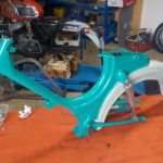 20.9 Motocykl rozebrán a nachystán na lakování. Nyní začíná mravenčí práce a my třídíme, sepisujeme, chystáme várku dílů na chromování, zinkování, nikl. Čeká nás rozpůlení motoru, go podvozku, výplet kol, shánění chybějících a poškozených dílů…