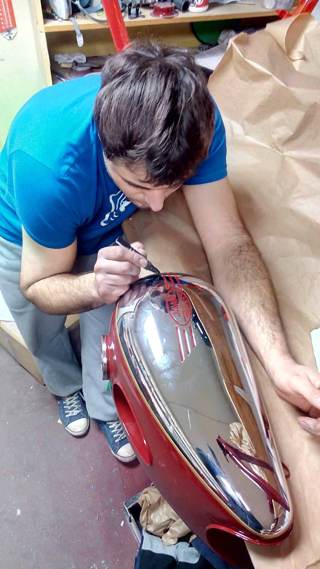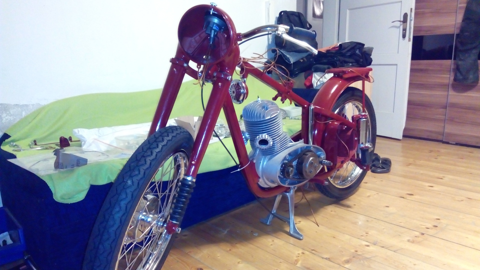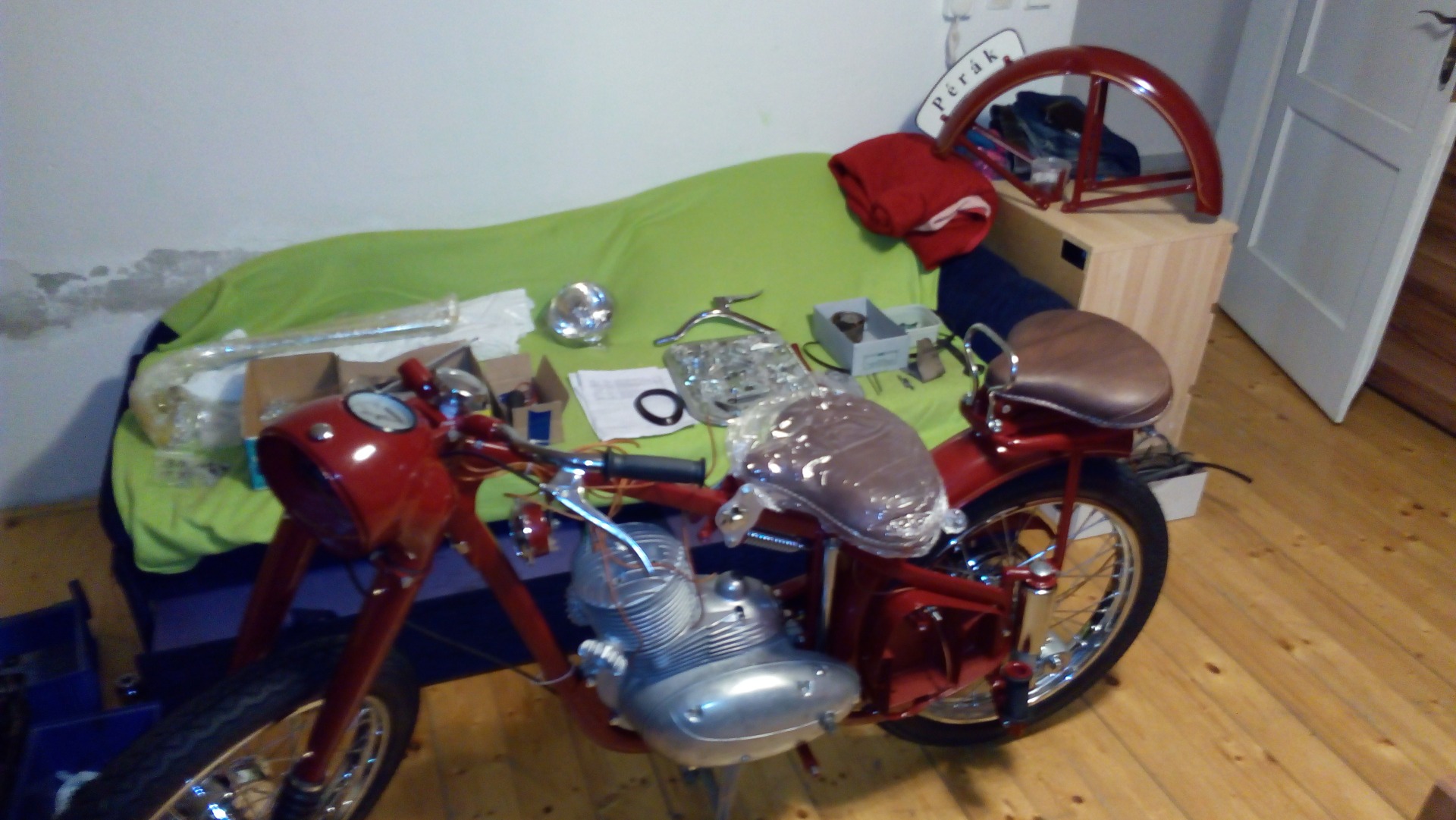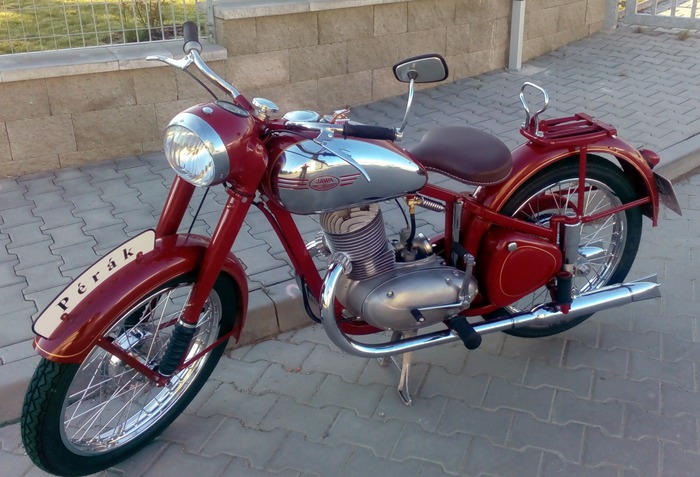 Jedna z prvních kompletních renovací se snahou o zachování co největšího množství původních, originálních dílů. Jawa 250 typ 11, rok 1949, vin 374**. Motocykl zakoupen na druhém konci republiky jako hromádka dílů koncem září 2015. Postupně sehnány chybějící díly typu FJ spínací skříňka, FJ přepínač světel a kryt karburátoru. Renovace začala po novém roce, 2.3.2016 byla slavnostně dokončena a pérák vystaven na jarní MotorTechně Brno.